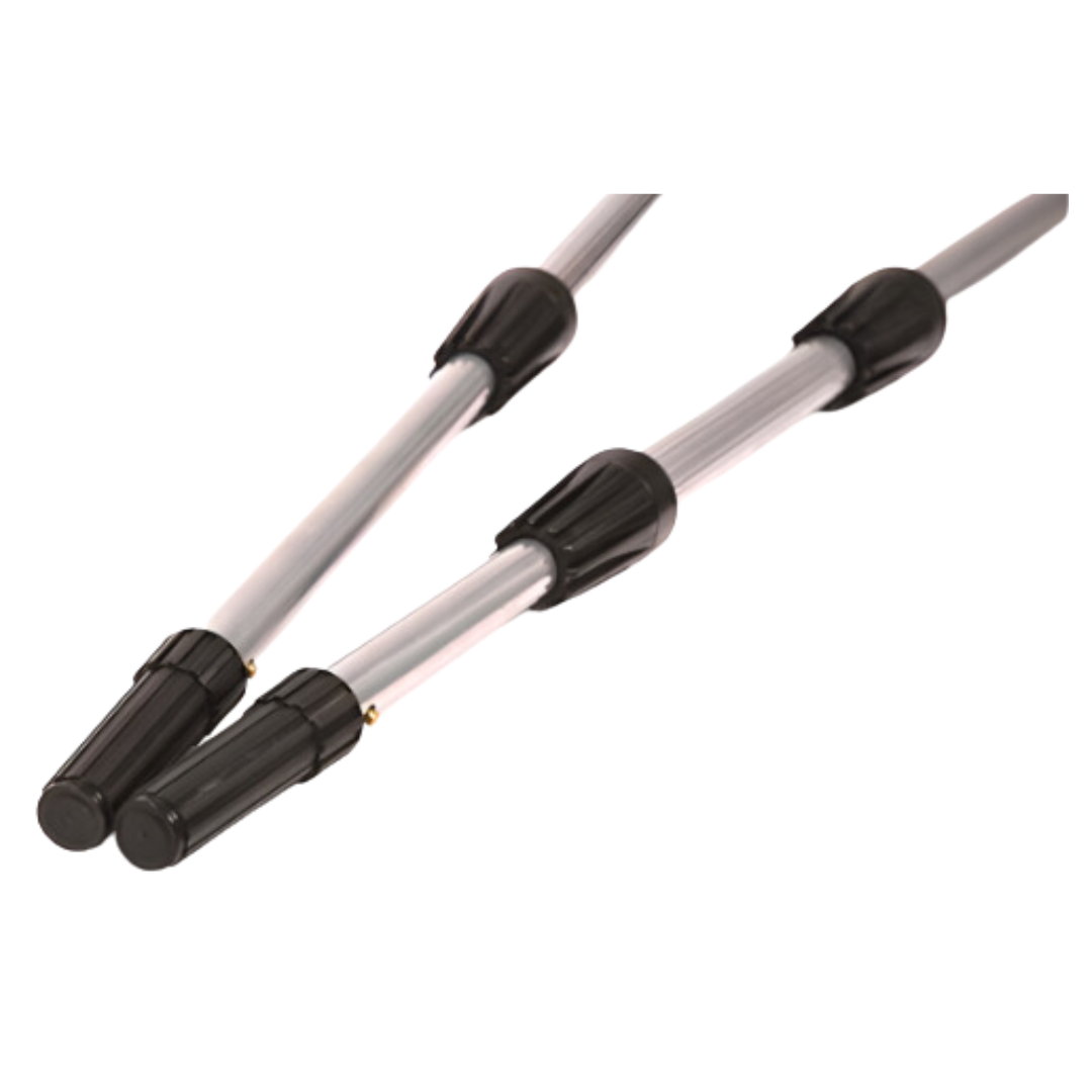 Extensor telescópico de aluminio templado profesional. Ideal para limpieza en altura con herramientas como lavavidrios, secavidrios, plumeros y rodillos. Se extiende de 1,20 m hasta 11 m. Disponible en 2 y 3 tramos, con ajuste mediante virolas plásticas negras. La punta de rosca plástica incluye resorte de acero inoxidable y bronce, y se puede quitar para agregar una articulación que permite diferentes ángulos. Cuenta con empuñadura de goma ergonómica y antideslizante. Uso profesional.