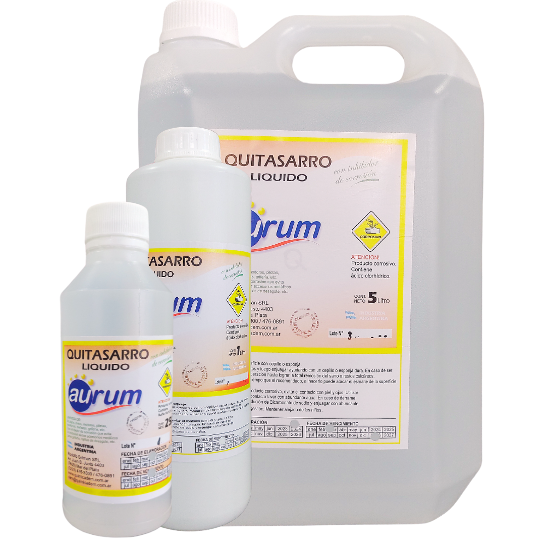 El Quitasarro líquido Aurum es ideal para remover sarro de una amplia variedad de superficies, pisos, azulejos, inodoros, bañeras, griferías, etc.