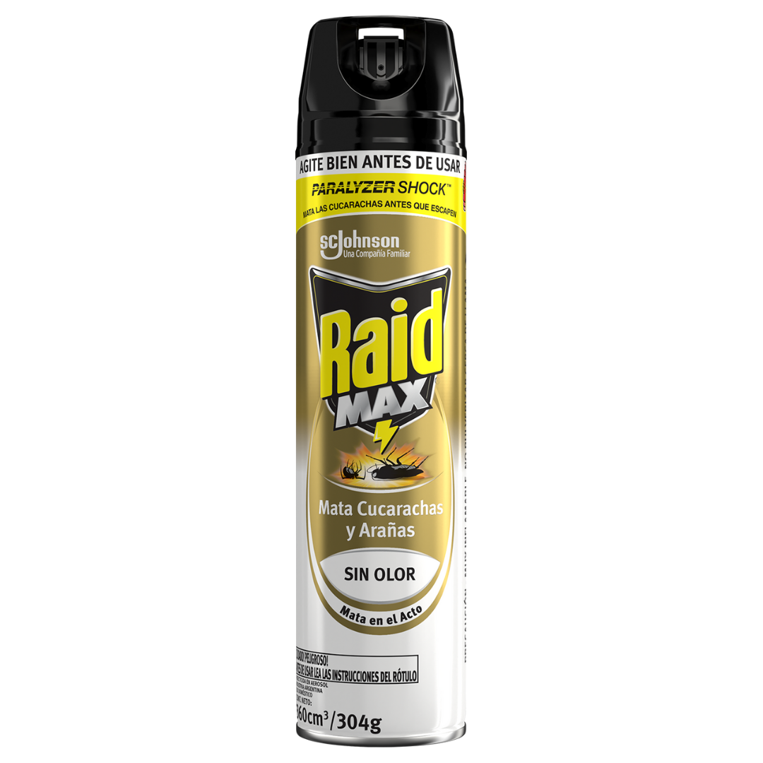 Raid Max Mata Cucarachas y Arañas combina todo el poder de Raid con solventes especiales que evitan el olor intenso y desagradable de los cucarachicidas comunes. Y además tiene triple acción: mata en el acto, mata los huevos de las cucarachas y continua matando por hasta 6 semanas.