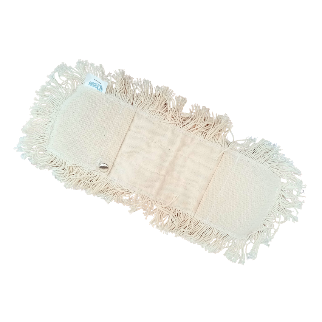 Repuesto de algodón con botones, para usar con armazón profesional plástico fijo o armazón profesional metálico fijo. Para barrido de superficies lisas. Se puede utilizar en seco, con atrapa polvo. Es lavable y reutilizable. Es ideal para pisos de madera, plastificados, cerámicos, porcelanato, cemento alisado, etc.