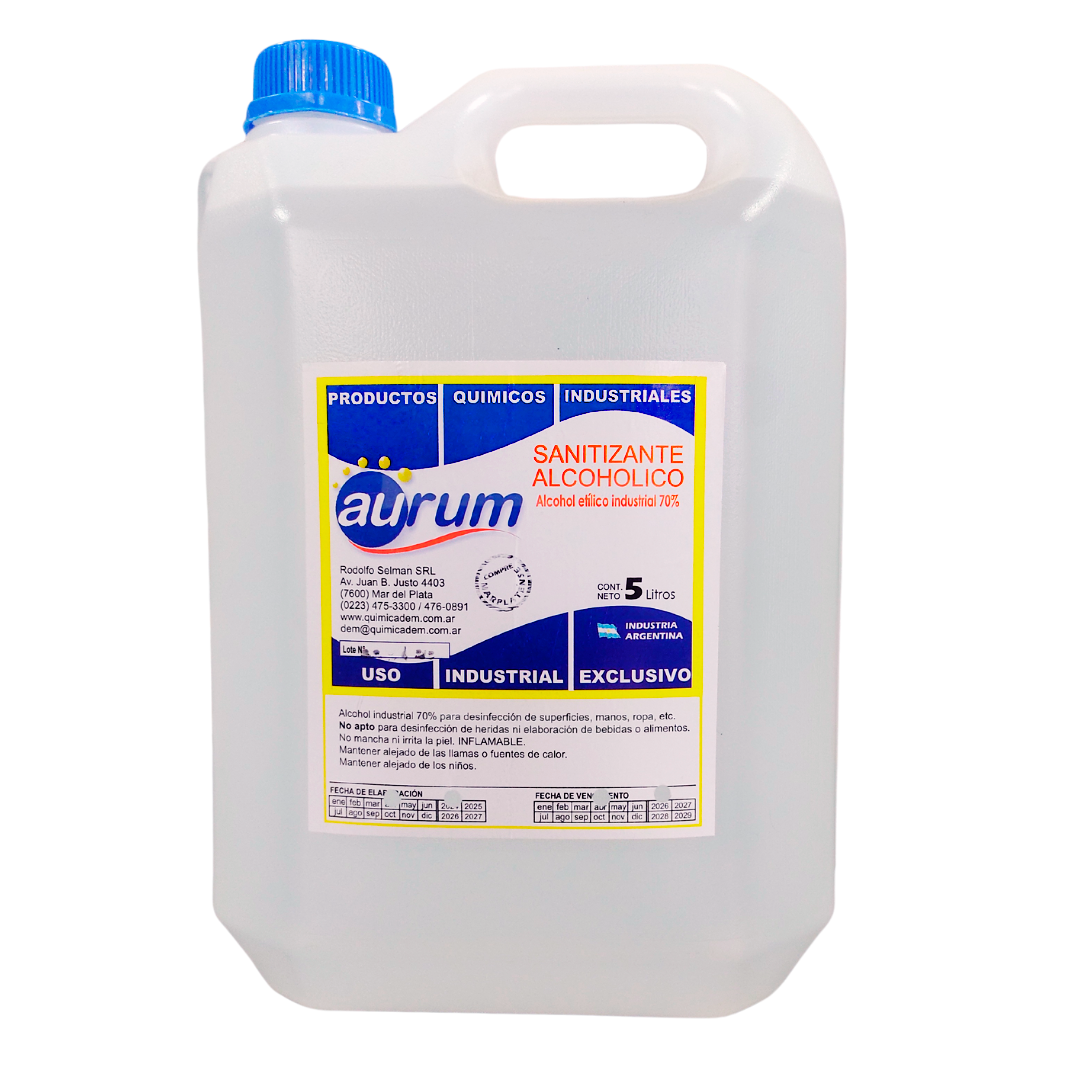 Alcohol industrial al 70% para desinfección de superficies, manos, ropa, etc. No apto para desinfección de heridas ni elaboración de bebidas o alimentos. No mancha. INFLAMABLE.
