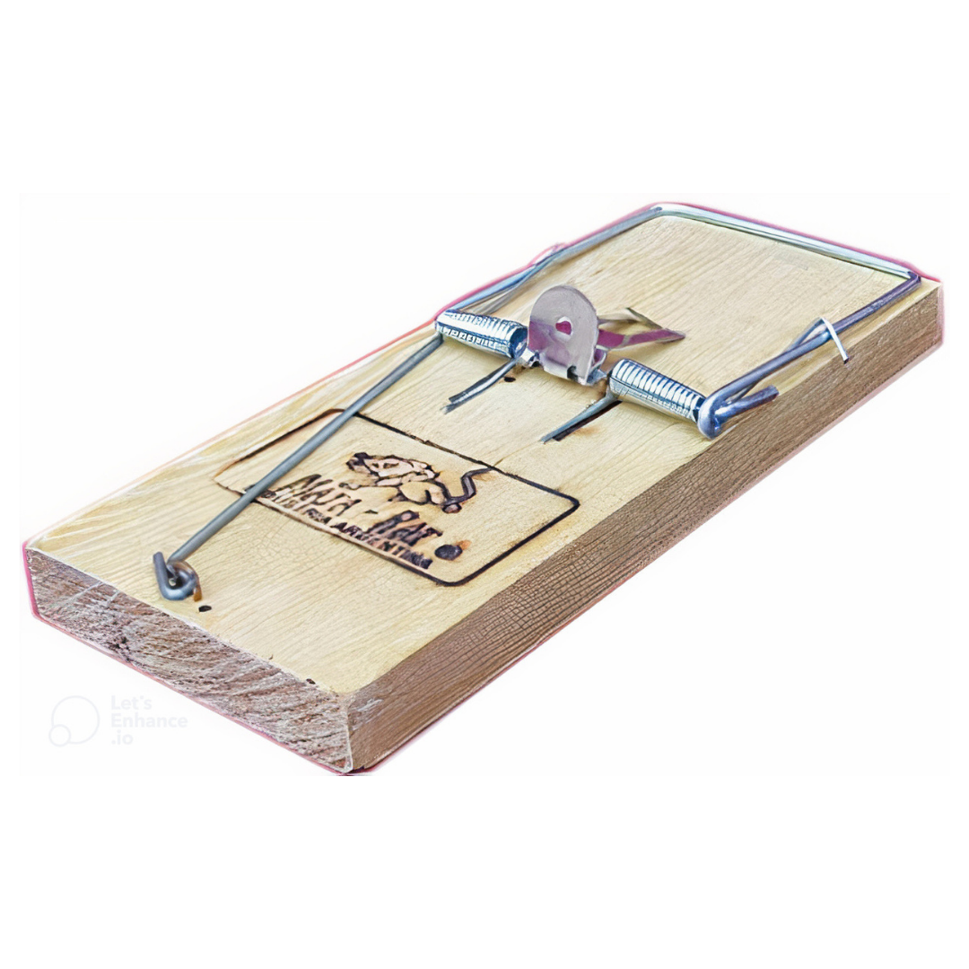 Trampera para ratas con base de madera y resorte. Sus medidas son 18 cm de largo por 7 cm de ancho. Su uso es sencillo, y es reutilizable.